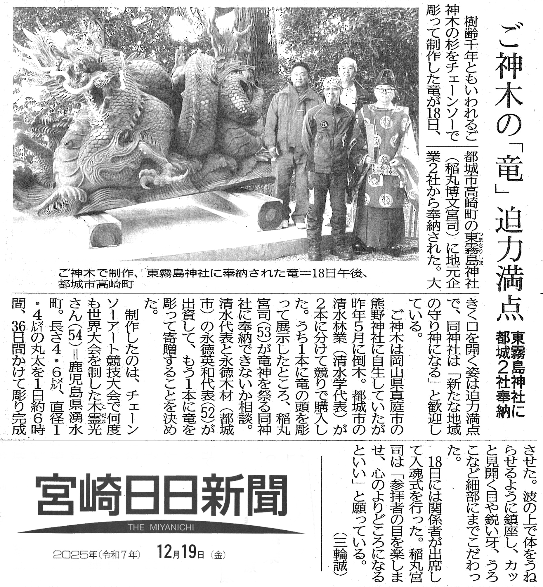 2025年12月19日(金)宮崎日日新聞様に記事が掲載されました。 樹齢千年ともいわれるご神木の杉をチェーンソーで彫って制作した竜が地元企業の2社から奉納されました。 大きく口を開く竜の姿は迫力満点!!12月18日に完成者が出席し入魂式を実施いたしました。 ご参拝に立ち寄られた際はぜひご覧ください!