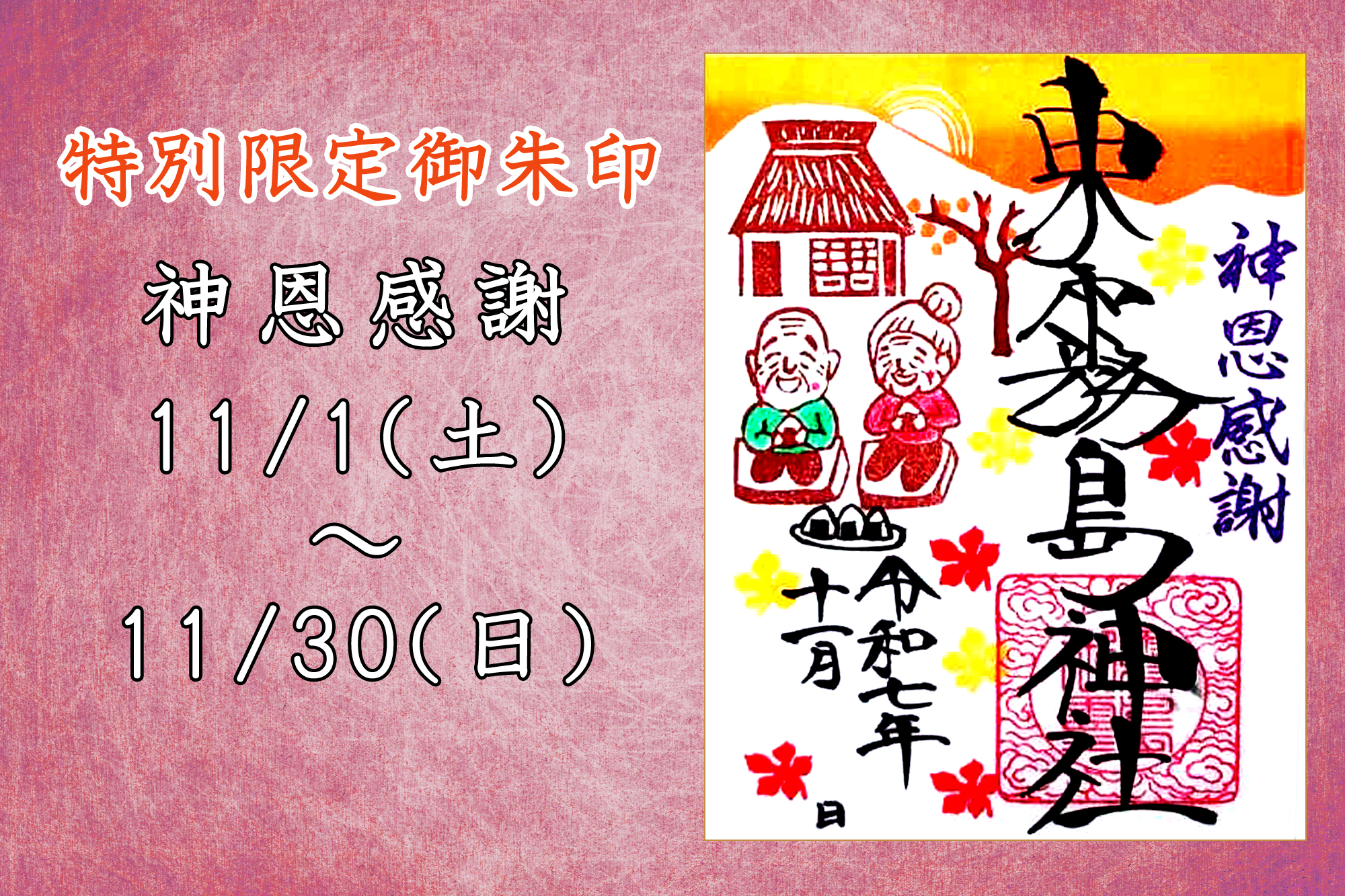 11月23日は「勤労感謝の日」として国民の祝日となっていますが、本来はその年の新設を神前に供え、 収穫の神恩に感謝する「新嘗祭(にいなめさい)」の日です。 戦後、11月23日は勤労感謝の日となり「勤労をたっとび、生産を祝い、国民互いに感謝しあう」(祝日法) となりましたが、現在でも全国津々浦々の神社では、神恩に感謝するおまつりを粛々と執り行っています。 特別限定御朱印(11/1~11/30まで) 授与料800円 ※紫泥墨でお書き致します。 ※書き手により自体が異なりますのでご了承ください。